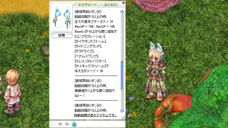 ▲「究極精錬お楽しみチケットGetキャンペーン2026」のおかげで今回の「ラグ缶2026 February」は結構購入されているようで、B賞の装備もわりと流通価格が安めになっています。この機会にとエレメンタルマスター向けの「+7 青猫耳鈴リボン[1]」を購入してエンチャントしてみたのですが、こちらにも超越段階1の効果が追記されていました。