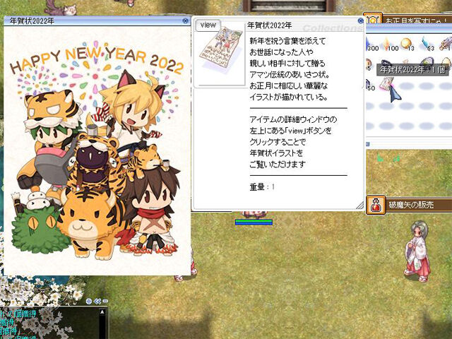 さて、2021年12月21日(火)の定期メンテナンス終了後からは、アマツでのお正月イベント「お正月2022 おもちをモリモリ食べタイガー! アマツ盛運初詣」がプレオープン。とりあえず「自動映写機」のレンタルと「年賀状」の購入が可能になっています。それ以外のイベントコンテンツはお正月が近づいてからのスタートということで、NPCが準備中という感じです。