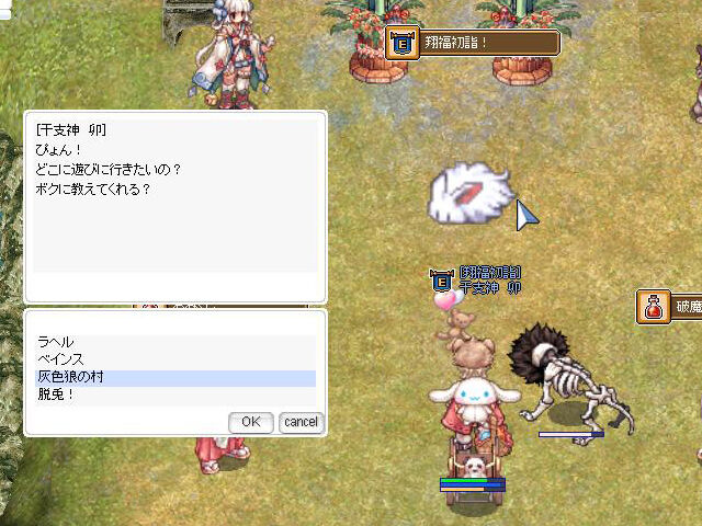 ▲今年の干支神様、NPC「干支神 卯」では「お雑煮」を納品することで転送も可能。アニバーサリーイベントが終わり、イベントホールに行けない間はこの転送を利用して狩り場に赴くのもアリです。ただし、「お雑煮」を購入で獲得した場合(15,000zeny)は、ちょっと高くつきますのでご注意を。まぁ「ジョンダパス」があれば無料なんですけどね(リアルマネーの件は考えないものとします)。