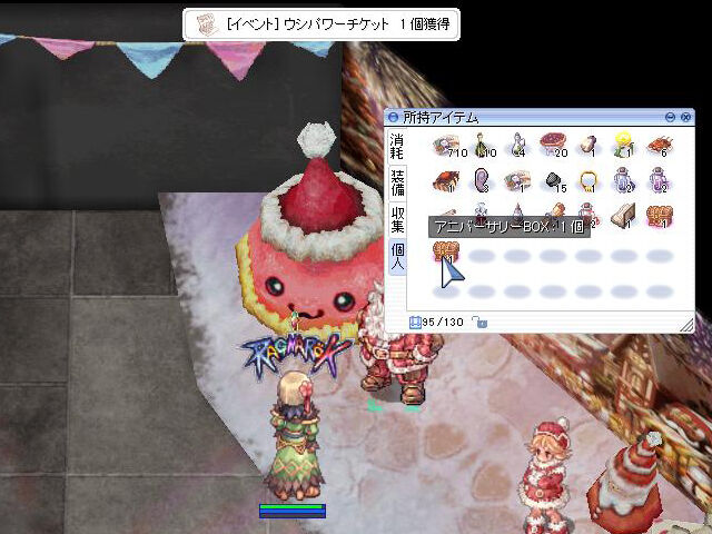 イベント会場北東のルティエブースにやってきた「サンタ」からは、季節イベントのクリア数に応じて「アニバーサリーBOX」がもらえます。今年のすべての季節イベントをクリアしていると合計7個もらえるようですね。「アニバーサリーBOX」からはイベント限定の肩にかける物装備などが出現。低確率でレアなペットの卵や「[イベント] ウシパワーチケット」、「[イベント] インベントリ拡張チケット」なども入手できるようです。