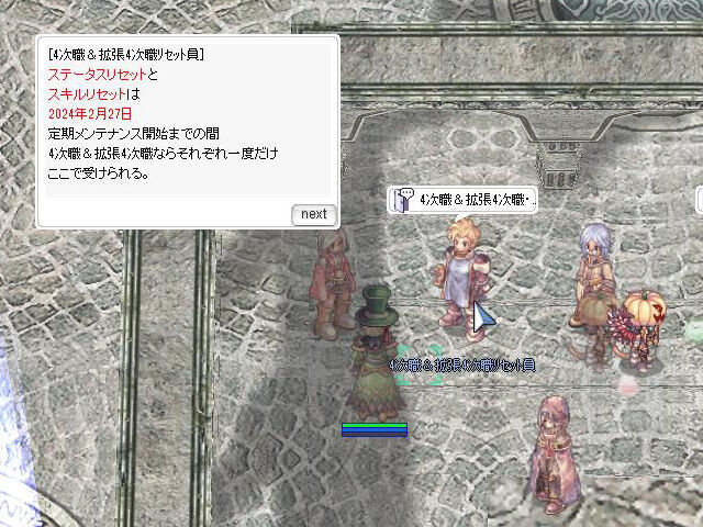 また、同様に、2024年2月27日(火)定期メンテナンス開始前までの間、4次職、拡張4次職は、ステータスとスキルがそれぞれ1回ずつリセット可能になっています。こちらはジュノーの「催眠術師」とは別枠で、その「催眠術師」の隣にNPCが登場しています。4次職でスキルが増えた職業はもちろん、拡張4次職で新スキルの前提スキルが取れていなかった構成のキャラの見直しをするにはもってこいのチャンスです。忘れずに活用していきましょう。