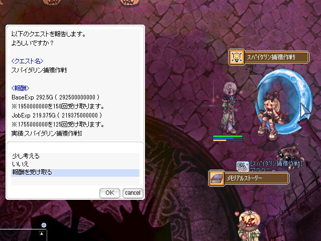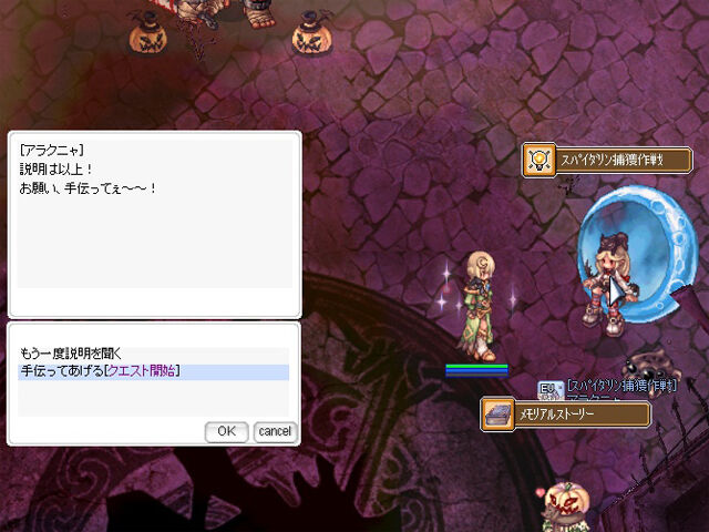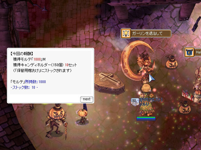 ちなみに「ニブルヘイムカボチャ農場」には「ガーリン」と「スパイダリン」というモンスターが敵として出現。これらは過去のハロウィンイベントで登場していたモンスターですが、次回のハロウィンイベントからは「ミニガーリン」、「ミニスパイダリン」に変更されるとのこと。今回登場した本物(?)は過去のイベントで登場した「ガーリン」や「スパイダリン」とは比べ物にならないくらいの強さとなっていますので、見た目が同じでもあなどらないようにしていきましょう。