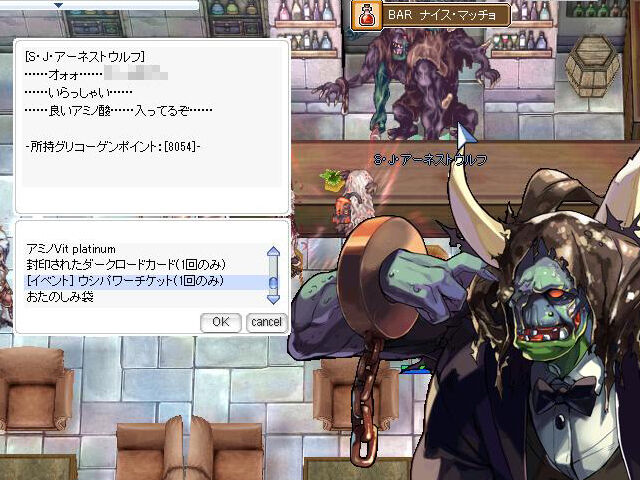▲イベントポイント(グリコーゲンポイント)を消費して回復やアイテムが購入できる「BAR ナイス・マッチョ」では、「封印されたダークロードカード」と「[イベント] ウシパワーチケット」も入手可能。忘れずにゲットしておきましょう。