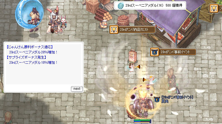 報酬として、経験値はもちろん、23周年アニバーサリーイベントのイベント会場で利用できる「23rdスーベニアメダル」がもらえます。「スーベニアメダル」はイベント開始後はZenyで購入することもでき、1K、1M、1Gという3種類が用意されています。それぞれは、1K=1,000Zeny相当、1M=1,000,000(100万)Zeny相当、1G=1,000,000,000(10億)Zeny相当となっています。