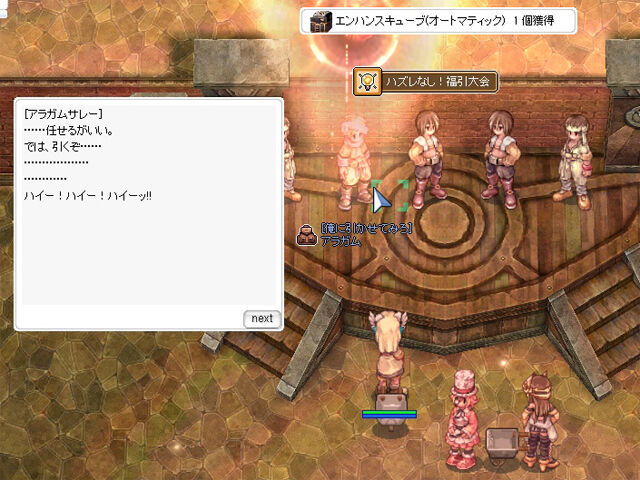 ▲私は衣装装備狙いで「福引スーパーデラックス」を1回引いてみましたが、結果は「エンハンスキューブ(オートマティック)」でした。うーん、悪い結果ではないのですが、評価に困る感じですね……。撮れ高としてはイマイチ(笑)。