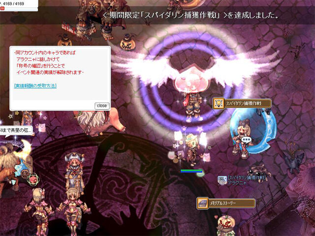 こちらの「スパイダリン捕獲作戦」、経験値報酬もさることながら、回数に応じて特別な報酬もゲットできるようになっています。注目は4回達成時の「硬化ナイトメアテラーの卵」。その他にも7回目で「[衣装] 一つ目ジャック」、10回目で「[衣装] スパイダリン」、また、実績解除に応じて各種称号なども獲得できるようになっています。