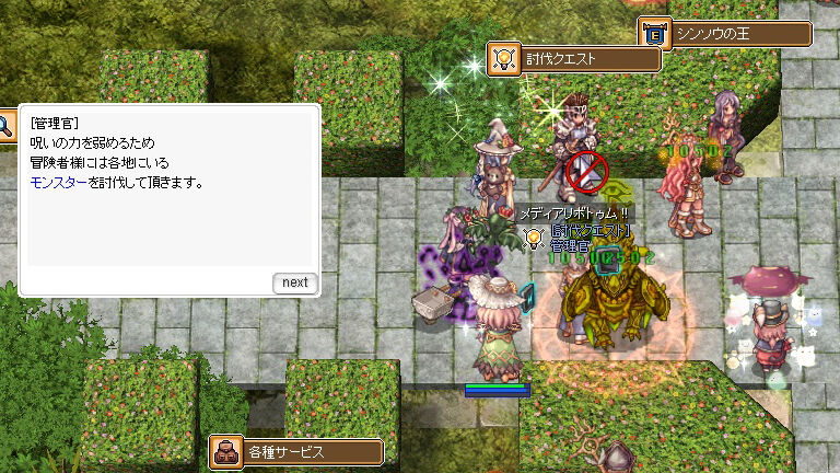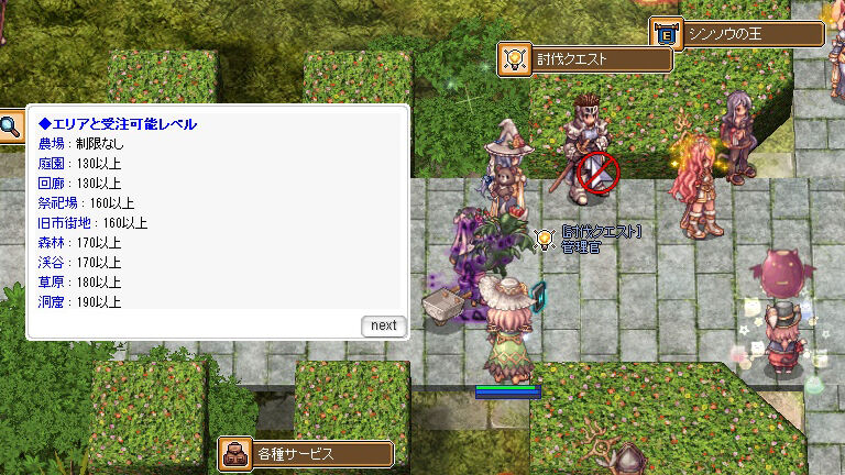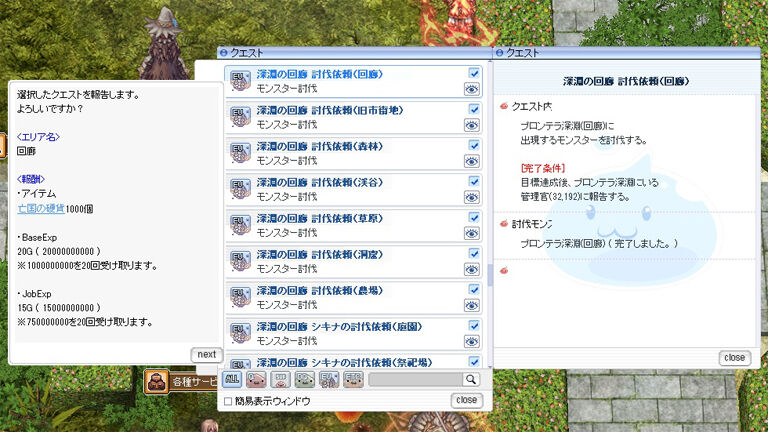 討伐クエストはBaseLvに応じて受けられるものを一括で受諾します。敵が強くてサクサクと進めないという場合は1~2段階低めの狩場に落として挑戦してみるといいでしょう。