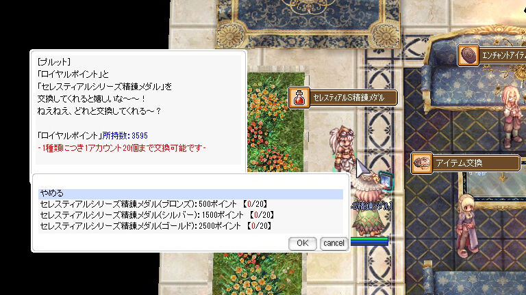 イベントではイベントポイントである「ロイヤルポイント」で、セレスティアルシリーズの精錬メダルが交換可能になりました。ブロンズ、シルバー、ゴールドの3種類を1アカウントにつき20個ずつ交換可能です。